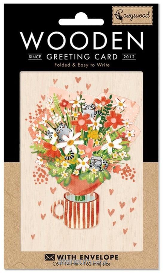Drewniany karnet w formacie C6 z kopertą. W środku nie zawiera tekstu. Ten karnet jest w 100% biodegradowalny, wykonany przy użyciu minimalnego nakładu energii, gazu i wody. Jego wytworzenie zużywa 5 razy mniej drewna niż wykonanie karnetu papierowego. Karnet posiada certyfikat FSC, gwarantujący odpowiedzialne pozyskiwanie drewna. Wyprodukowany na Litwie.