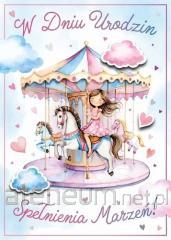 Kartka jest zdobiona opalizującą folią holograficzną, zawiera życzenia oraz kolorowy środek. W zestawie znajduje się koperta, kolorystycznie uzupełniająca się z kartką. Format złożonej kartki: B6