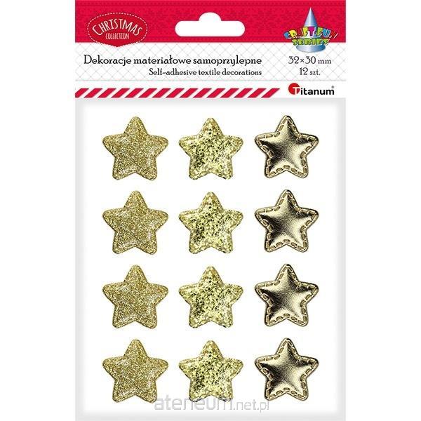 Dekoracje samoprzylepne materiałowe gwiazdki PU 32x30mm 3 wzory: drobny brokat, duży brokat, gładkie złote 12szt.