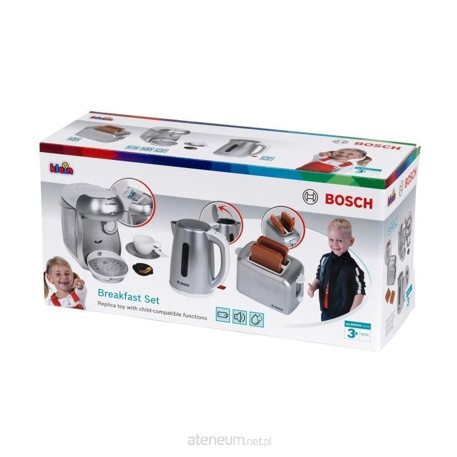 Klein 9216 Zestaw śniadaniowy Bosch Srebrny Zestaw Klein powstał na licencji Bosch, dlatego też są wierną kopią prawdziwych urządzeń produkowanych przez tę firmę. Firma Klein od lat produkuje odpowiedniki prawdziwych narzędzi i akcesoriów AGD, przeznaczone do zabawy dla najmłodszych. Zestaw składa się z ekspresu do kawy, czajnika , tostera oraz naczyń i sztućców. Cały zestaw AGD znajdujący się w zestawie jest w kolorze srebrnym, dzięki czemu całość stanowi doskonałą imitację prawdziwych produktów firmy Bosch. Ekspres jak prawdziwy, posiada ociekacz, który można ustawić na dwóch wysokościach w zależności od rodzaju postawionej szklanki i zaparzanej kawy. Ekspres został także wyposażony w efekt dźwiękowy, który sprawia zabawę jeszcze bardziej realistyczną. Do właściwego funkcjonowania zabawki wymagane są baterie, które nie są częścią zestawu. Ponadto ekspres posiada otwieraną górną klapkę, gdzie umieszcza się zabawkowe kapsułki z kawą, a dodatkowo zabawka ma także prawdziwy przepływ wody. Czajnik posiada podnoszoną za pomocą naciśnięcia przycisku pokrywkę i także w ramach dobrej realistycznej zabawy można go uzupełnić wodą. Toster także jest bezpieczny do zabawy dla dzieci, gdyż nie nagrzewa się, a tosty automatycznie wyskakują po kilku sekundach, sygnalizując zakończenie imitacji procesu podgrzania dźwiękiem dzwonka. Zabawka nie wymaga użycia baterii. Ponadto w tym dużym zestawie śniadaniowym znajdują się filiżanka, spodek do filiżanki a także mała łyżeczka, 2 sztuczne tosty i kapsułka do ekspresu. Wszystkie materiały, które zostały użyte do stworzenia dużego zestawu śniadaniowego są najwyższej jakości, a także bezpieczne dla dziecka. Cały zestaw pozwoli każdemu dziecku na naśladowanie rodziców w sposób bezpieczny i pełen dobrej zabawy. Wielkość wszystkich elementów i akcesoriów zestawu jest dopasowana do potrzeb i rączek dziecka. Zabawka z pewnością będzie również świetnym uzupełnieniem pozostałych zestawów kuchennych firmy Klein. Specyfikacja: Produkt jest zabawką Zabawka przeznaczona dla dzieci powyżej 3 roku życia Waga : 1,55 kg Ilość w opakowaniu zbiorczym : 4 Kraj pochodzenia : Chiny Seria zabawek AGD firmy KLEIN realistycznie odzwierciedla prawdziwe urządzenia wprowadzone na rynek przez najbardziej znane i jakościowo najlepsze marki produktów. Dla małych gospodyń domowych to niesamowita atrakcja! Dzieci z chęcią uczą się pomagać w wykonywaniu domowych czynności jednocześnie świetnie się przy tym bawiąc. Każdy ze sprzętów kuchennych pomoże w przygotowaniu zarówno małej przekąski jak i wykwintnego przyjęcia dla lalek lub koleżanek. Dodatkową zaletą tych zabawek jest to, że ich kolorystyka jest odpowiednia dla dziewczynek oraz dla chłopców.
