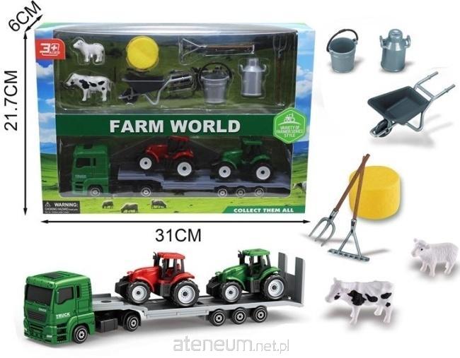 Odkryj fascynujący Zestaw Farm World, idealny dla małych miłośników życia na wsi i maszyn rolniczych. Ten bogaty zestaw zawiera wszystko, co niezbędne do odgrywania realistycznych scenek z farmy. Centralnym elementem jest duża zielona ciężarówka z naczepą, służąca do transportu dwóch szczegółowych modeli traktorów - jednego w kolorze czerwonym i drugiego w kolorze zielonym. Oprócz pojazdów w zestawie znajdują się figurki zwierząt hodowlanych, w tym krowa i owca, które urozmaicą zabawę w hodowlę. Zestaw uzupełniają liczne akcesoria gospodarskie, takie jak wiaderka, metalowe bańki na mleko, taczka, narzędzia rolnicze (widły i grabie) oraz żółty krążek siana. Całość jest zapakowana w estetyczne pudełko z okienkiem o wymiarach około 31 cm na 21,7 cm, co ułatwia przechowywanie i sprawia, że jest to doskonały pomysł na prezent. Produkt przeznaczony jest dla dzieci w wieku 3 lata i starszych, wspierając rozwój wyobraźni i zdolności manualnych poprzez kreatywną zabawę w farmerskim świecie. Zbieraj inne zestawy z serii Farm World, aby poszerzyć swoją kolekcję.