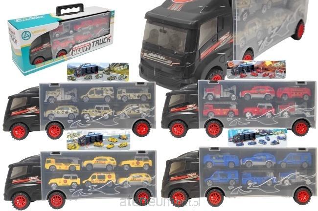 Spraw swojemu dziecku ogromną radość tym fantastycznym zestawem 2 w 1. Duży, solidny transporter w kolorze czarnym z czerwonymi kołami to nie tylko samodzielna zabawka, ale także praktyczny mobilny garaż. Naczepa posiada przezroczyste, otwierane boki, które kryją w sobie sześć mniejszych, szczegółowo wykonanych pojazdów tematycznych. To doskonałe rozwiązanie, które pozwala na kreatywną zabawę w domu i w podróży, a jednocześnie uczy utrzymywania porządku, gdyż po skończonej zabawie wszystkie autka można schować z powrotem do ciężarówki. Wygodna rączka na górze naczepy ułatwia przenoszenie całego zestawu. Zabawka zapakowana jest w estetyczne pudełko, dzięki czemu idealnie nadaje się na prezent.