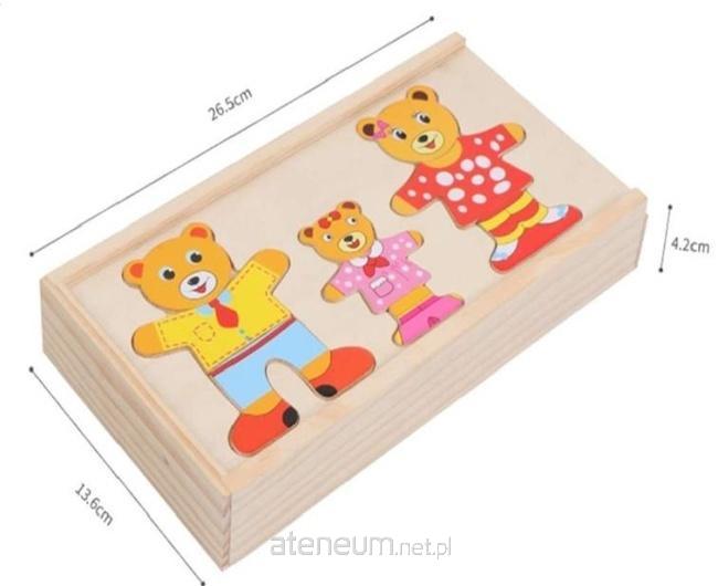 Odkryj uroczą drewnianą układankę Ubierz Misie, która zapewni godziny kreatywnej i rozwijającej zabawy. Ten klasyczny zestaw składa się z drewnianego pudełka oraz bogatej kolekcji wymiennych części, które pozwalają na przebieranie trzech postaci misiów reprezentujących rodzinę: taty, mamy i ich pociechy. Każda postać jest podzielona na trzy elementy: główkę, tułów z ubraniem oraz nogi. Zadaniem dziecka jest dopasowanie lub dowolne pomieszanie tych elementów, tworząc niezliczoną ilość zabawnych stylizacji. Układanka rozwija u dziecka małą motorykę, koordynację wzrokowo-ruchową, a także umiejętność logicznego myślenia i spostrzegawczość. Żywe kolory i przyjazne wzornictwo zachęcają do zabawy, a solidna konstrukcja z drewna gwarantuje trwałość produktu. To idealny prezent, który wspiera rozwój dziecka poprzez wciągającą i edukacyjną rozrywkę.