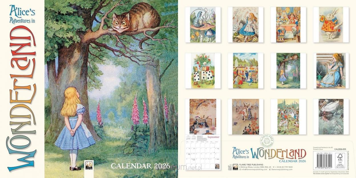 Kalendarz ścienny o wymiarach 300 300 mm, zatytułowany Alice in Wonderland Wall Calendar 2026 (Art Calendar), wydany przez Flame Tree Publishing. Motywem przewodnim są klasyczne ilustracje inspirowane ponadczasową opowieścią Lewisa Carrolla, przenoszące do niezwykłego świata pełnego absurdu, magii i nieoczywistego uroku. Obrazy wprowadzają w baśniową atmosferę Krainy Czarów, gdzie logika ustępuje fantazji, a każda scena pulsuje humorem, tajemnicą i niepowtarzalną wyobraźnią.