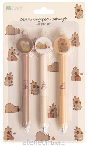 Zestaw trzech uroczych zmazywalnych długopisów żelowych z motywem kapibar.