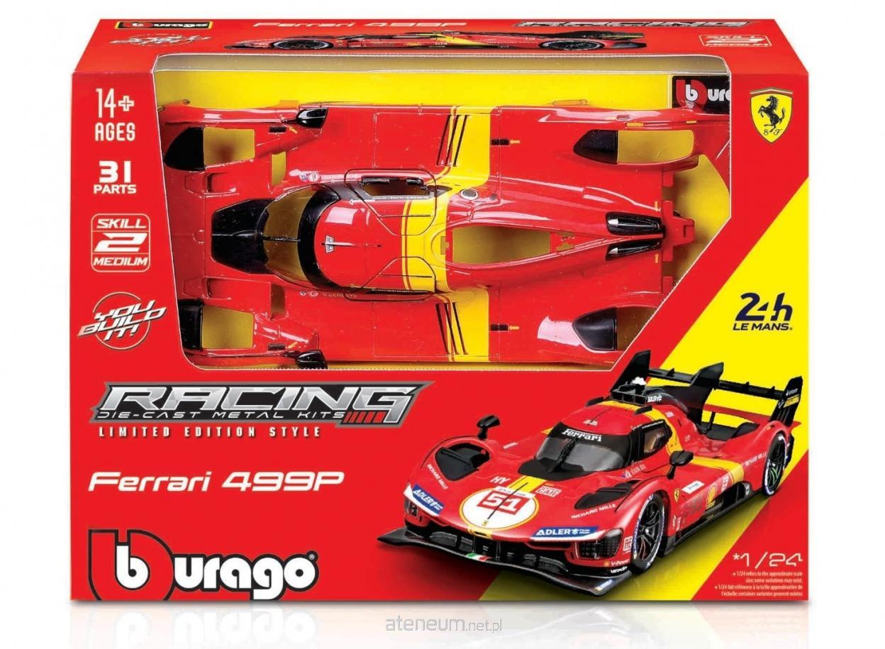 Ferrari 499P #51 - James Calado, Antonio Giovinazzi, Alessandro Pier Guidi oryginalny produkt marki Bburago, oficjalny, licencjonowany wzór pojazdu, metalowy model z plastikowymi elementami, perfekcyjne odwzorowanie szczegółów, model z serii KIT - do samodzielnego złożenia. Ruchome elementy: drzwi. Wymiary opakowania: 23 x 10 x 17 cm. Model samochodu do składania bez kleju, z dołączonym śrubokrętem, który posiada polakierowaną metalową karoserię oraz ruchome elementy. Po złożeniu staje się w pełni funkcjonalnym, jeżdżącym pojazdem, idealnym jako zabawka dla dzieci lub model dla kolekcjonerów. Samochód ma otwierane drzwi, a opakowanie zawiera szczegółową instrukcję montażu, ułatwiającą składanie i zapewniającą satysfakcję z tworzenia.