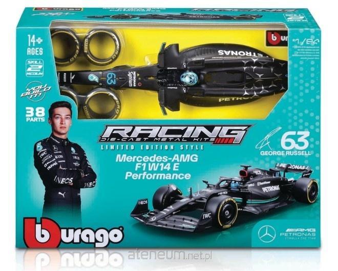 BOLID F1 Mercedes-AMG W14 E Performance (2023) #63 George Russell oryginalny produkt marki Bburago, oficjalny, licencjonowany wzór pojazdu, metalowy model z plastikowymi elementami, perfekcyjne odwzorowanie szczegółów, model z serii KIT - do samodzielnego złożenia. Model samochodu do składania bez kleju, z dołączonym śrubokrętem, który posiada polakierowaną karoserię oraz ruchome elementy. Po złożeniu staje się w pełni funkcjonalnym, jeżdżącym pojazdem, idealnym jako zabawka dla dzieci lub model dla kolekcjonerów. Opakowanie zawiera szczegółową instrukcję montażu, ułatwiającą składanie i zapewniającą satysfakcję z tworzenia.