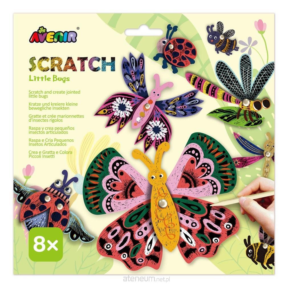 Wydrapywanki - Małe Insekty. Stwórz własne, ruchome owady dzięki temu kreatywnemu zestawowi! Zabawa z wydrapywaniem pozwala dzieciom odkrywać świat kolorów, kształtów jednocześnie rozwijając zdolności manualne i kreatywność. Dzięki prostemu wydrapywaniu kolorów dzieci mogą samodzielnie projektować motyle, biedronki, ważki i inne owady, a specjalne szpilki pozwalają łączyć elementy, tworząc ruchome mini-marionetki. Zestaw to godziny twórczej zabawy, idealne zarówno do samodzielnej pracy, jak i wspólnych projektów z przyjaciółmi lub rodzeństwem. Zawartość: 4 arkusze ze wzorami do wydrapania, 12 pinezek i elementów mocujących, 1 arkusz filcu, 1 rysik do zdrapywania. Dla dzieci powyżej 3 roku życia.