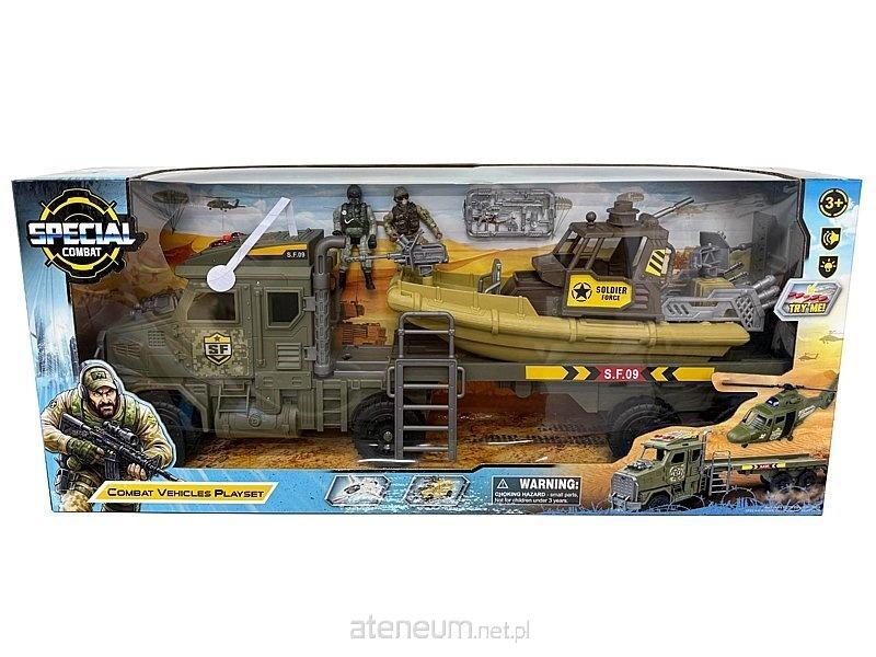 Auto wojskowe z lawetą i łodzią, figurki żołnierzy; 64,5x28x12,5cm