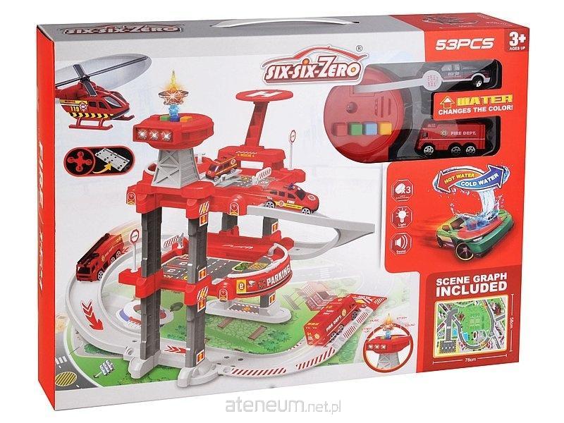 parking 2 poziomowy straży pożarnej, wym.rozłożonego 60x44x28cm, 2 auta zmieniające kolor pod wpływem wody, śwuatło, dźwięk; 46x35x8cm, W/B