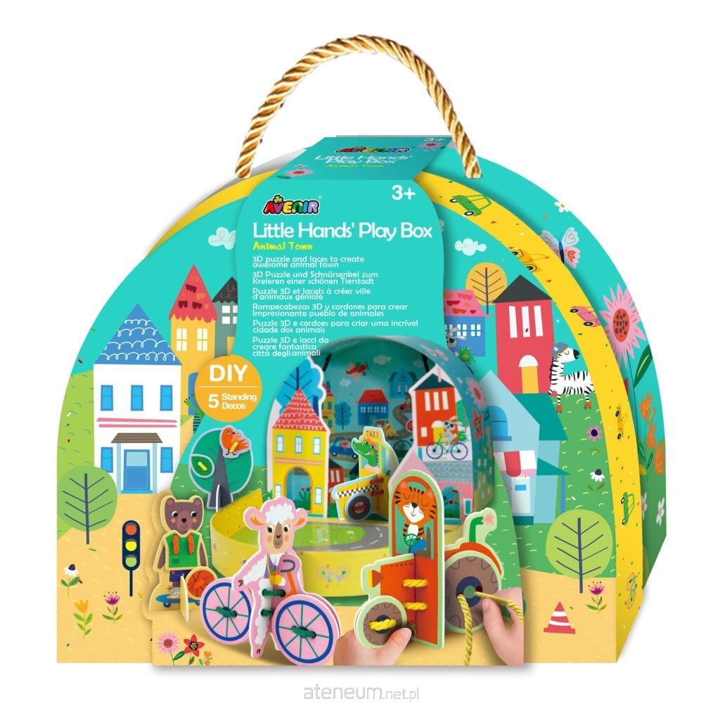 Box do zabawy - Miasteczko zwierząt to kreatywny zestaw 3D, który łączy budowanie, sznurowanie i swobodną zabawę w jednym. Dzieci mogą stworzyć własne tętniące życiem miasteczko, składać elementy przestrzennej układanki, nawlekać sznurówki i wymyślać historie z udziałem sympatycznych zwierzątek. Zestaw doskonale wspiera rozwój motoryki małej, koordynację ręka - oko oraz wyobraźnię przestrzenną. To idealna propozycja do kreatywnej, angażującej zabawy, która jednocześnie uczy poprzez działanie. Zawartość: 3 wycięte karty, 3 drewniane patyczki, 1 arkusz naklejek, plastikowe elementy do składania. Dla dzieci powyżej 3 roku życia.