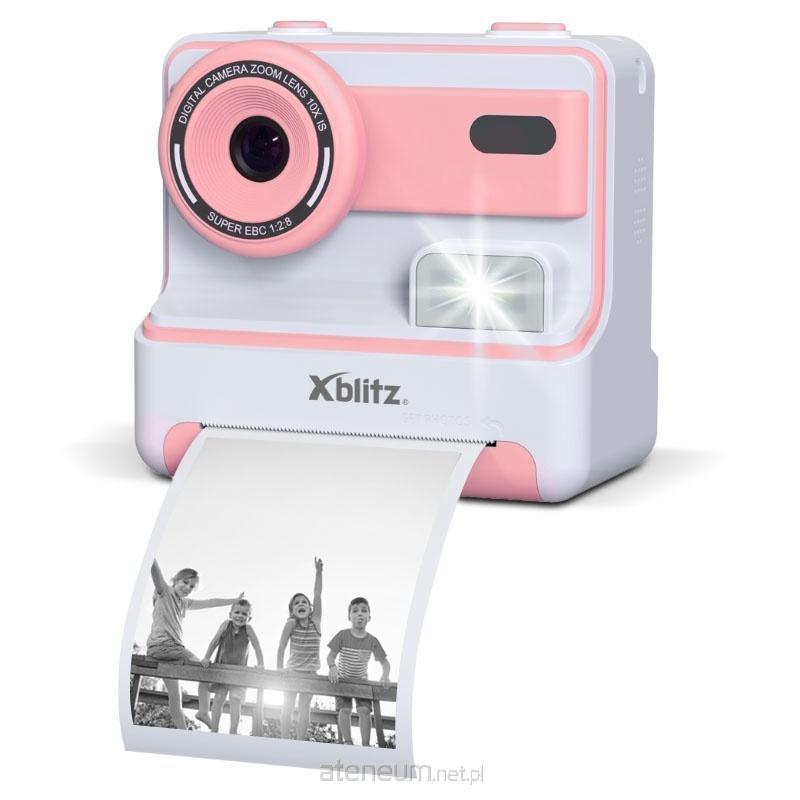 Zawartość zestawu: Aparat Xblitz Flash PINK, 3papier termiczny, naklejki, kabel USB-C, instrukcja obsługi, smycz, pisaki, karta microSD 16GB, czytnik kart pamięci