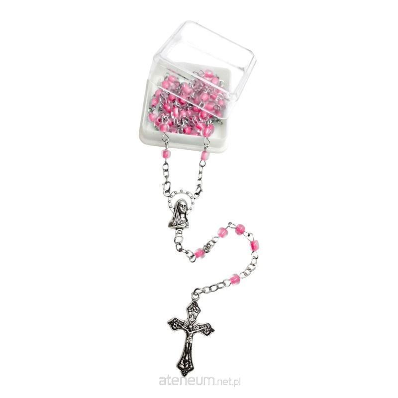 Koraliki różańca wykonane są z przeźroczystego plastiku, w którego środek ma subtelny, jasnoróżowy kolor. Takie połączenie nadaje im wyjątkowej elegancji i atrakcyjnego efektu wizualnego, idealnego na prezent dla dziewcząt. Koraliki mają około 4 mm wielkości.
