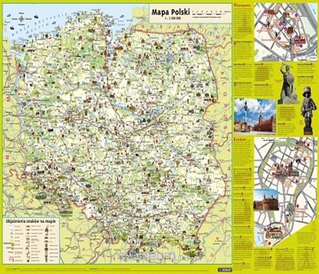 Podręczna mapa Polski dla dzieci jest nie tylko estetyczna i wygodna do wyeksponowania na ścianie. Zawiera treści, które przyciągają dzieci. Na jednej stronie zaznaczone są główne atrakcje turystyczne Polski, w miastach, i poza nimi, pokazane są parki narodowe, a wszystko ilustrują ładne rysunki. Ponadto pomiędzy miastami zaznaczono główne drogi z podziałem na autostrady i inne drogi krajowe oraz główne koleje. Obecną i byłą stolicę Polski: Warszawę i Kraków przedstawiono na planach z propozycją spacerów po ich zabytkowych centrach. Druga strona zawiera mapy i zdjęcia omawiające ukształtowanie terenu w Polsce - pokazując gdzie znajdują się góry z kotlinami, wyżyny, niziny, jaki im towarzyszy krajobraz. Opisy i zdjęcia oraz sugestywny rysunek pięter roślinnych w Tatrach wyglądają naprawdę zachęcająco. Ten szkolny temat jest w tej wersji naprawdę przyjazny