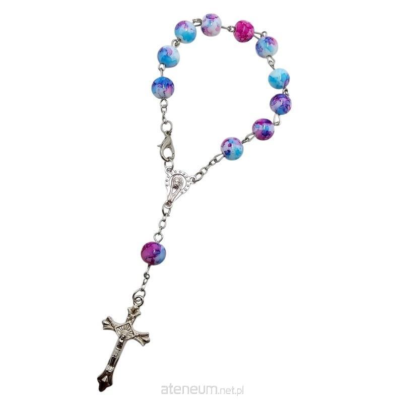 Elegancka dziesiątka różańca wykonana z pięknych, różowo-niebieskich szklanych koralików o średnicy 8 mm,imitujących naturalny kamień. Ta stylowa dziesiątka jest zapinana, co umożliwia jej wygodne noszenie lub zawieszenie, na przykład w samochodzie. Łącznikiem różańca jest delikatna postać Maryi, a całość zwieńczona jest ozdobnym, metalowym krzyżem o wymiarach 32x17 mm. To subtelne i pełne duchowego znaczenia akcesorium, idealne do codziennej modlitwy i jako wyraz wiary.