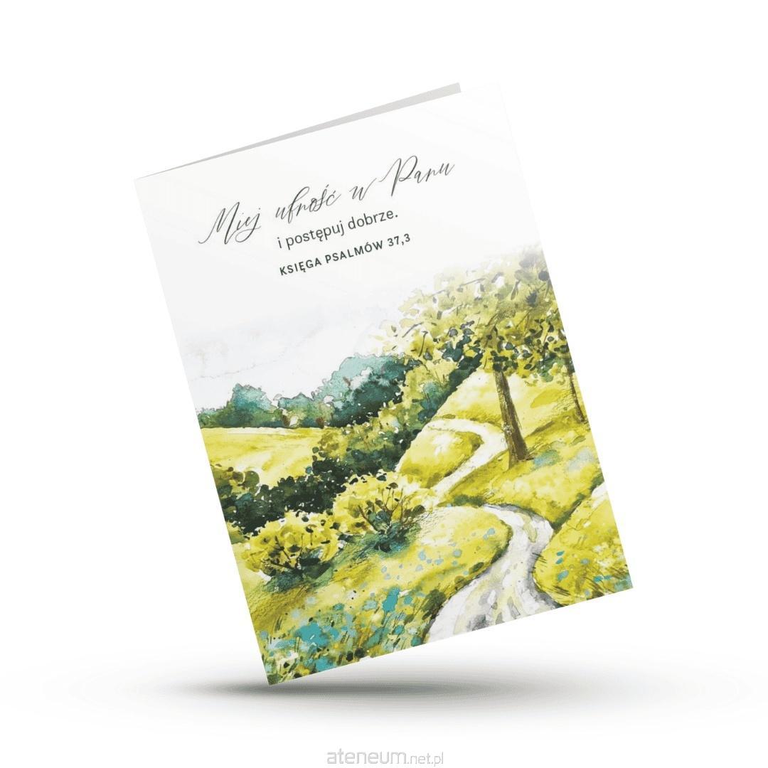 Kartka z cytatem z Księgi Psalmów 37,3 to subtelne przypomnienie o zaufaniu Bogu i czynieniu dobra na co dzień. Na kartce znajduje się delikatny, akwarelowy pejzaż w odcieniach zieleni i żółci.
