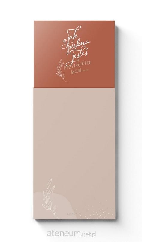 Minimalistyczny, kobiecy i pełen ciepła notes z magnesem O jak piękna jesteś, Przyjaciółko moja (Pnp 1,15) to praktyczny notatnik magnetyczny z inspirującym cytatem z Biblii. Subtelne połączenie ciepłego, terakotowego odcienia z jasnym beżem oraz delikatną roślinną grafiką tworzy nowoczesny, estetyczny design, który pięknie prezentuje się w kuchni, biurze czy domowym gabinecie.