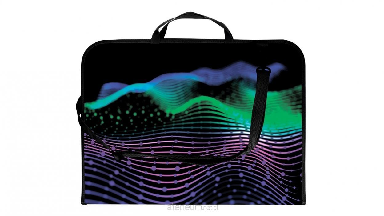 Teczka wykonana ze sztywnego tworzywa PP z ozdobnym nadrukiem oraz obszyciem w kotrastowym kolorze. Wymiary teczki 38x52 cm umożliwiają przechowywanie prac plastycznych w formacie A3 z zapasem miejsca. Wyposażona w zamknięcie na suwak oraz materiałowe rączki i odpinany pasek na ramię. Dodatkowa kieszeń wewnątrz ułatwia utrzymanie porządku przechowywanych prac. Grzbiet o szerokości 3 cm pozwala na przechowywania w teczce przyborów plastycznych.