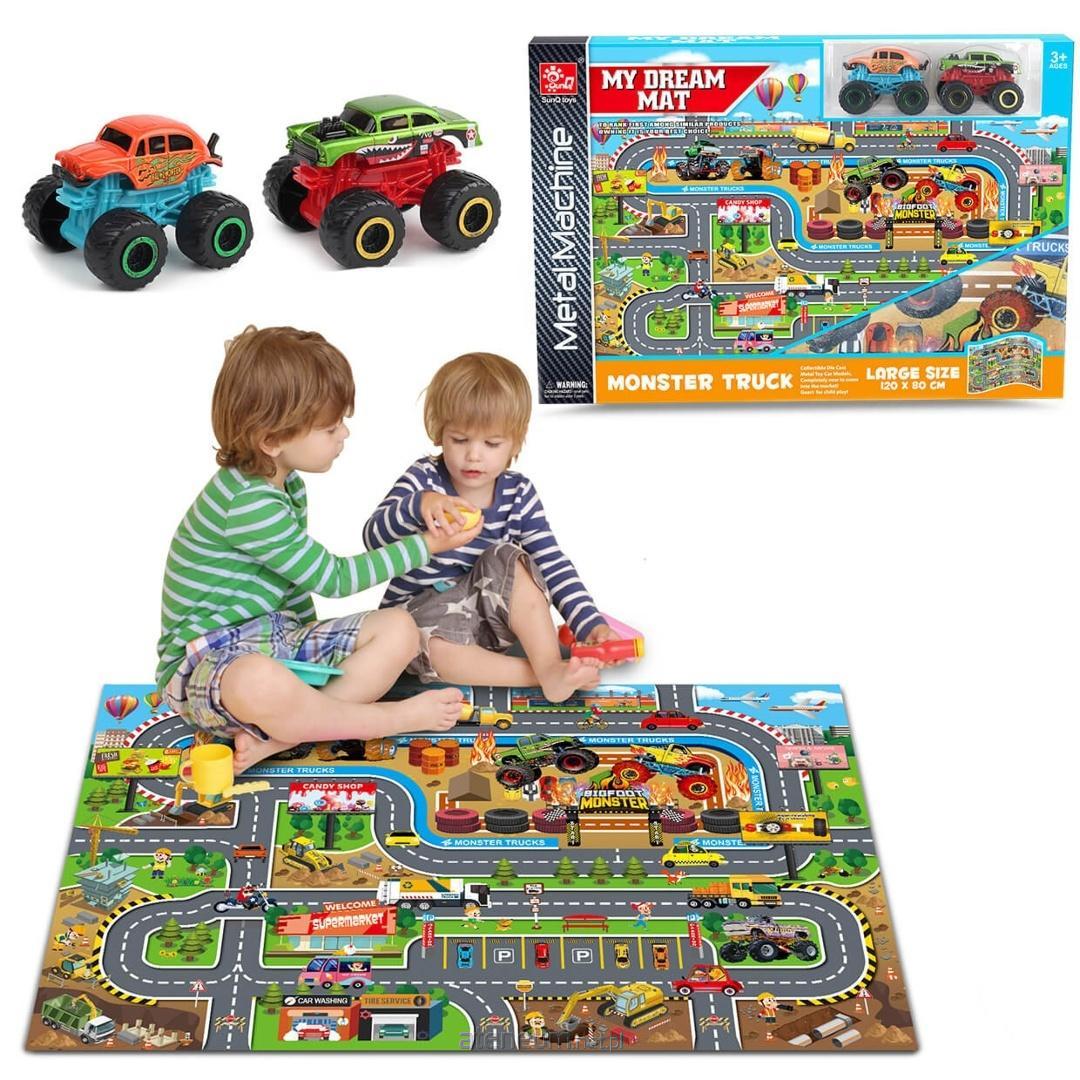 W zestawie z matą znajdują się dwa samochodziki Monster Truck