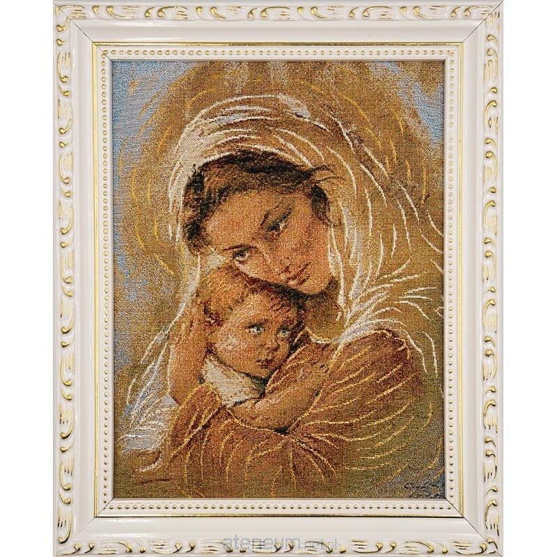 Zanurz się w pełnym ciepła i miłości przedstawieniu Matki Boskiej czule tulącej Dzieciątko Jezus na tym wyjątkowym, haftowanym obrazie. W malarskim ujęciu uchwycono intymny moment bliskości Maryi i Jej Syna. Matka z tkliwością obejmuje małego Jezusa, który spoczywa w Jej ramionach. Piękne, delikatne kolory oraz subtelne złote nici nadają scenie wyjątkowego blasku i duchowego ciepła, przypominając renesansowe arcydzieła. Obraz oprawiony jest w elegancką białą ramę, zdobioną złotymi detalami o szerokości około 3 cm, która doskonale podkreśla delikatność i piękno przedstawienia. Ten misternie wykonany obraz o wymiarach 22x27,5 cm będzie stanowił pełną ciepła ozdobę każdego wnętrza i inspirujący element kontemplacji macierzyńskiej miłości.
