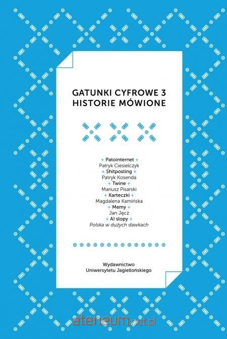 Gatunki cyfrowe 3 to trzeci tom cyklu poświęconego współczesnym formom ekspresji w kulturze cyfrowej, kontynuacja prac z lat 2018 i 2024. Tym razem autor koncentruje się wyłącznie na zjawiskach najnowszych mediów tych, które wyrosły w odpowiedzi na pandemię, przeciążenie informacyjne, rozwój sztucznej inteligencji i falę dezinformacji. Książka przedstawia sześć rozmów z praktykami współczesnej kultury internetowej: od badania patostreamingu i patointernetu, przez analizę shitpostingu, fenomen Twinea, zjawisko karteczek i przemiany memetyki, po groteskowy świat AI slopów i viralowego chałkonia. Każdy rozdział ukazuje kulturę cyfrową z perspektywy osób, które ją współtworzą lurkerów, archiwistów, memiarzy, administratorów. Tom powstał w ramach UBU labu Uniwersytetu Jagiellońskiego i stanowi zarazem zapis badań, praktyk i refleksji nad twórczością cyfrową, łącząc teorię z doświadczeniem uczestników sieci. To panorama współczesnych gatunków cyfrowych dynamicznych, płynnych i nieustannie redefiniujących granice sztuki, komunikacji i codzienności.