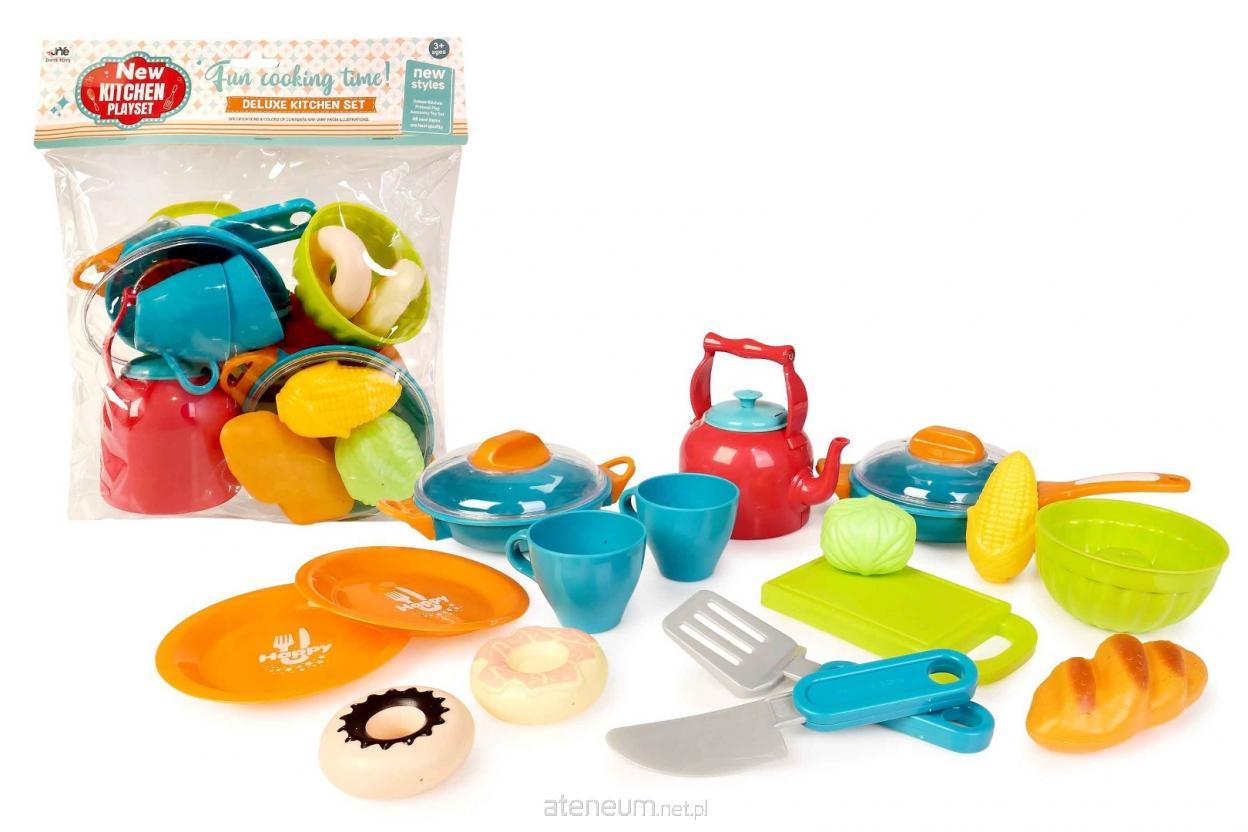 W zestawie: 2 patelnie o średnicy 11 cm, 2 przykrywki, 2 talerze, deska do krojenia, 2 kubki, czajnik, nóż, łopatka kuchenna, 6 produktów spożywczych; wym. opakowania: 28 x 30 x 9 cm; 3+