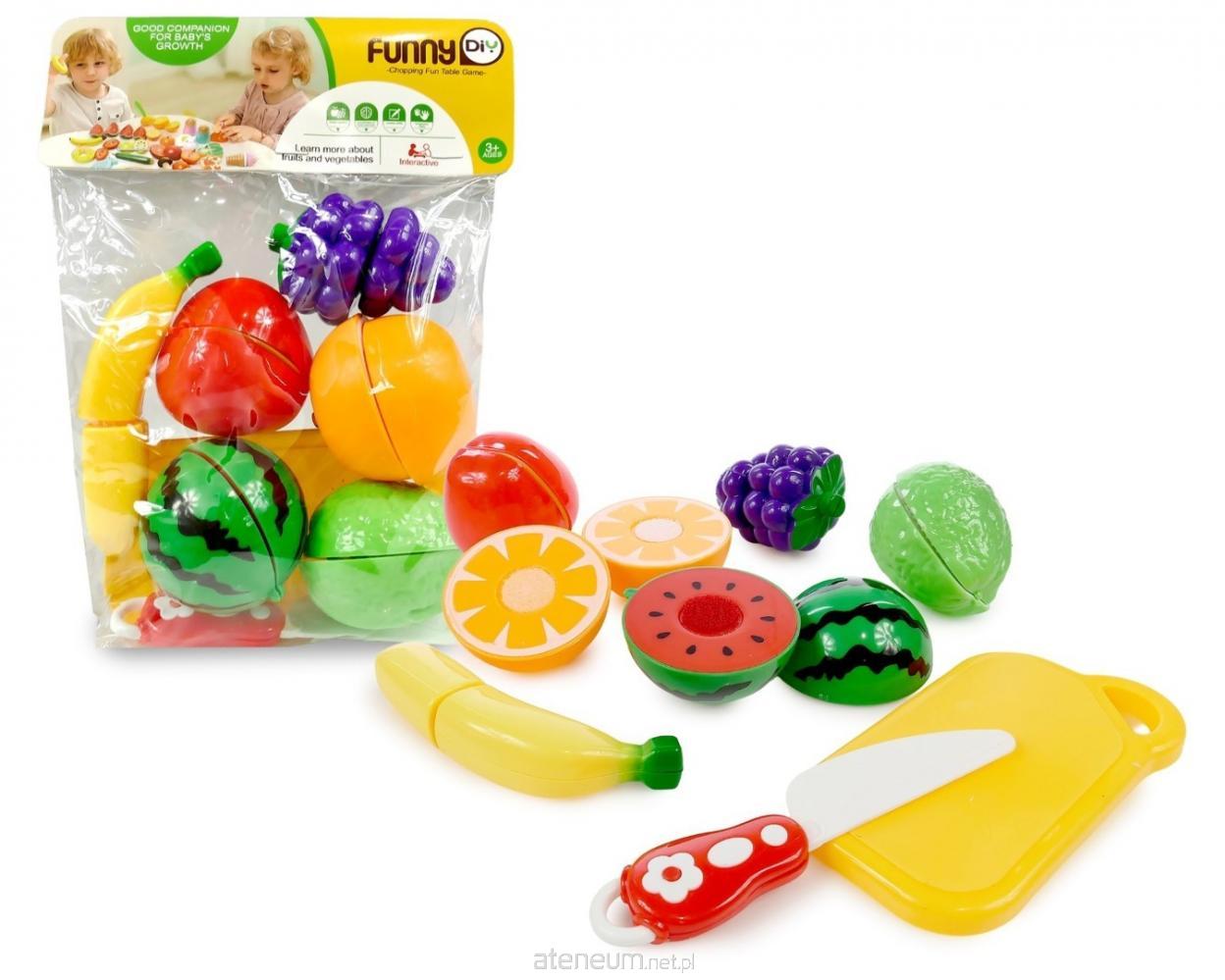 W zestawie: deska do krojenia, nóż, arbuz, pomarańcza, winogrono, banan, jabłko, limonka; funkcje: zabawa polega na krojeniu owoców tak, by rozdzielić rzepy łączące połówki; 3+