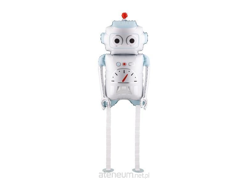 Chodzący balon foliowy Robot, w kolorze srebrno-jasnoniebieskim. Wymiary przed napompowaniem ok. 78 x 97 cm (30.7 x 38.2\\'\\'), wymiary po napompowaniu ok. 37 x 80 cm (14.6 x 31.5\\'\\'). Wysokość nóżek około 45 cm. Do napompowania helem. Zestaw zawiera słomkę.