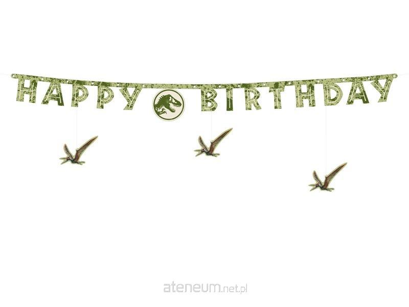 Baner papierowy Happy Birthday Jurassic World, mix kolorów, o wymiarach po rozłożeniu ok. 45 x 165 cm. Produkt do samodzielnego montażu - w zestawie znajdują się litery, sznurek i 13 nitów. Litery należy połączyć nitami i zamocować sznurek na brzegach baneru, aby go zawiesić.