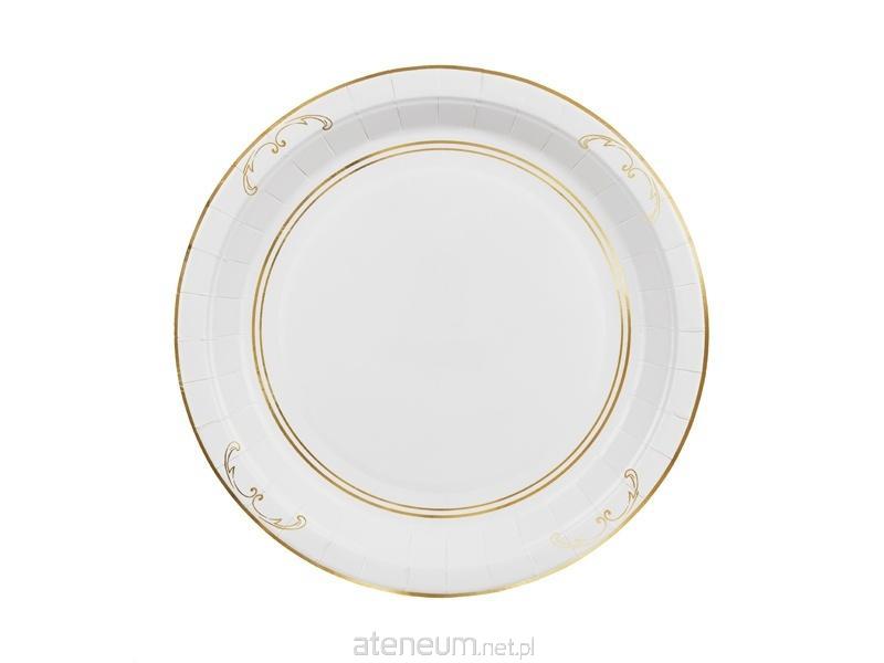 Talerzyki papierowe okrągłe w kolorze białym ze złotym ornamentem, średnica ok. 23 cm.(1 op. / 6 szt.)