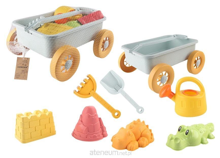 W zestawie: wózek do przewożenia piasku dł. 35 cm, łopatka dł.: 23,5 cm, grabki dł.: 20 cm, konewka wys. 12,5 cm, 4 foremki do piasku w kształtach: fragmentu muru, wieży zamkowej, krokodyla, smoka; wym. opak.: 35 x 23 x 24,5 cm; pakowane w siatkę; 3+