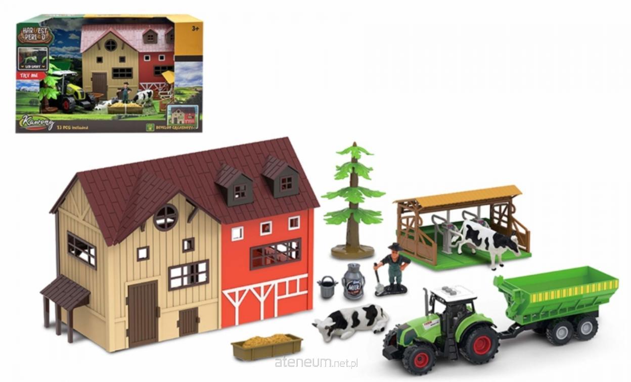 W zestawie: traktor, stodoła, przyczepka, stanowisko do dojenia krów, figurka rolnika, 2 figurki krów, 3 figurki narzędzi, figurka drzewa, funkcje: traktor - napęd frykcyjny, efekty świetlne, odgłosy pracy pojazdu, baterie: 3 x AG13 dołączone, 3+