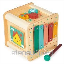Każda ścianka kostki to inna interesująca zabawa! Jest zegar do nauki godzin, cymbałki do gry, kołatka do pukania, są koła zębate jak i ruchome elementy - do przesuwania i obracania.