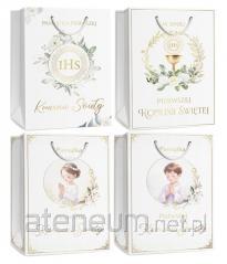 Książeczka z Okazji I Komunii Świętej w formacie A5 wraz z kopertą w środku.