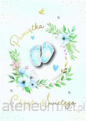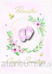 Książeczka z Okazji I Komunii Świętej w formacie A5 wraz z kopertą w środku.