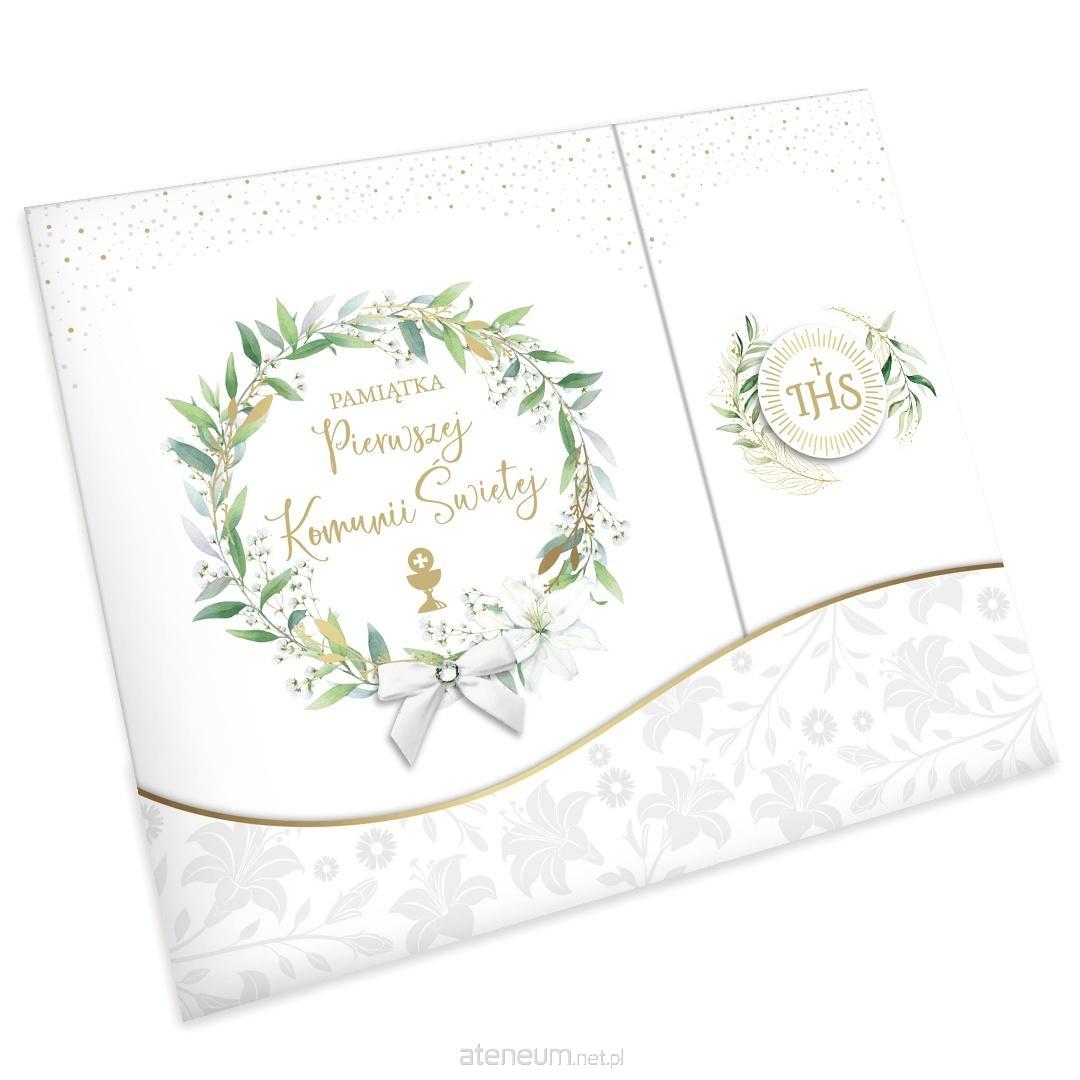 Książeczka z okazji I Komunii Świętej w formacie A4 wraz z kopertą w środku.