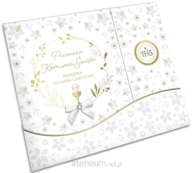 Książeczka z okazji I Komunii Świętej w formacie A4 wraz z kopertą w środku.