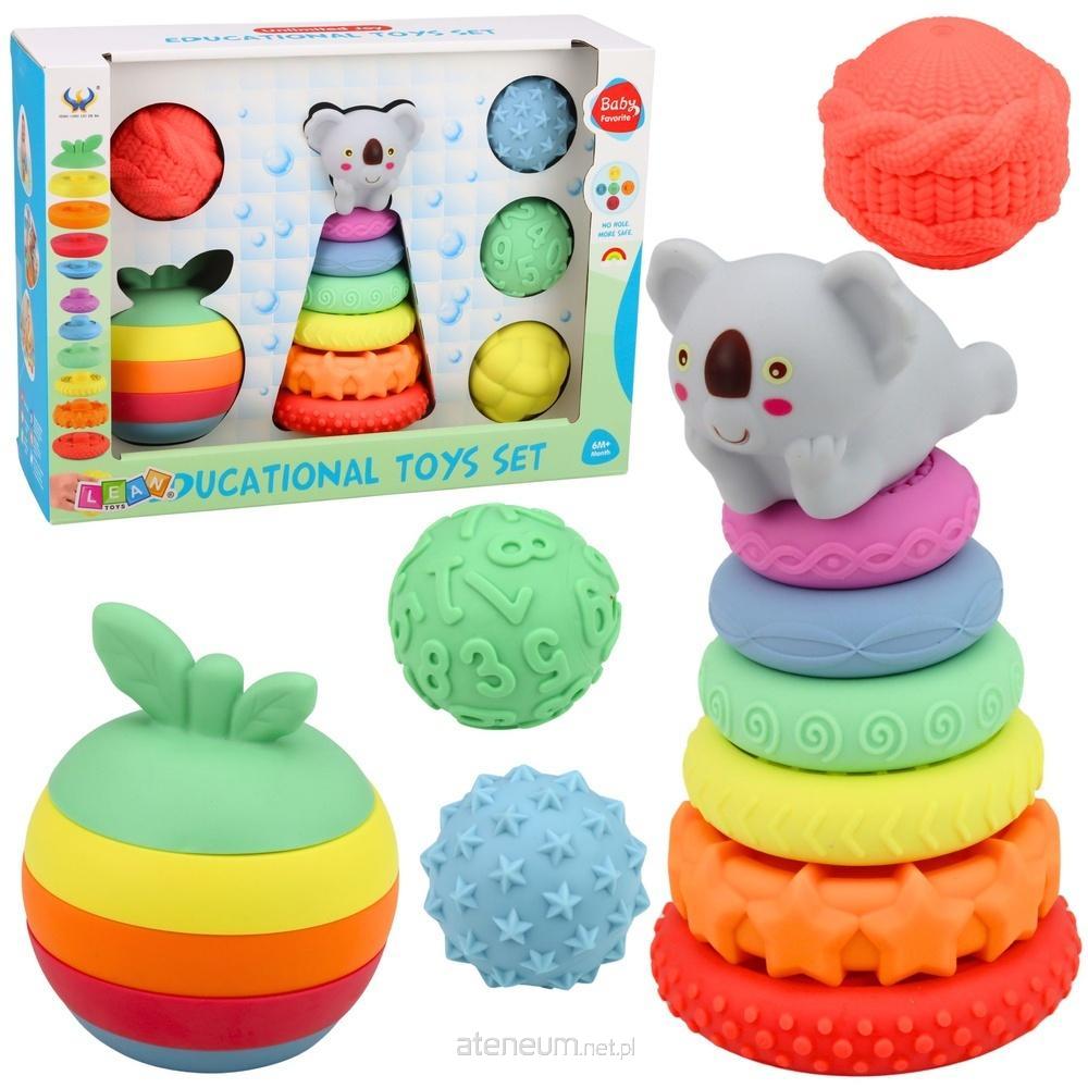 W zestawie znajduje się kolorowa piramidka do układania z uroczą figurką zwierzątka na szczycie, piłeczki sensoryczne o różnych wypustkach oraz miękkie, gumowe elementy w żywych kolorach. Różnorodne faktury pomagają dziecku poznawać świat poprzez dotyk, a intensywne barwy przyciągają uwagę i rozwijają percepcję wzrokową. Elementy można ściskać, układać, toczyć oraz dopasowywać, co wspiera rozwój motoryki małej oraz logicznego myślenia.