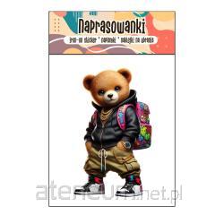 Naprasowanka prezentująca zabawną postać Misia na kolorowej deskorolce.