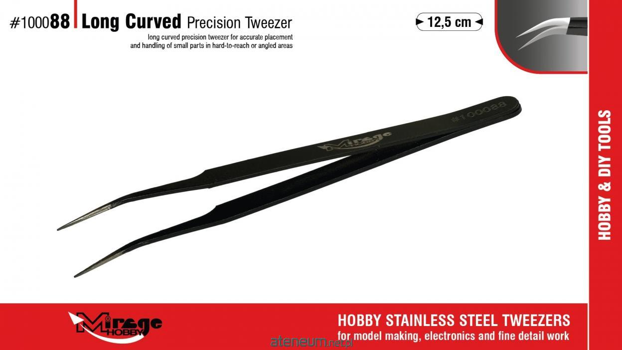 Seria Mirage Hobby Precision Tweezers to seria wysokiej jakości pęset wykonanych ze stali nierdzewnej, zaprojektowanych do precyzyjnej pracy z drobnymi i delikatnymi elementami. Pęsety zapewniają doskonałą kontrolę, stabilny chwyt oraz komfort pracy podczas montażu, malowania i pozycjonowania detali. Każdy model w serii został opracowany z myślą o konkretnym zastosowaniu - od bardzo drobnych elementów, przez części fototrawione, aż po pracę w trudno dostępnych miejscach. Cechy pęset Mirage Hobby Precision Tweezers: stal nierdzewna - trwałość i odporność na korozję precyzyjnie spasowane końcówki wysoka kontrola chwytu ergonomiczny kształt przeznaczone do modelarstwa, elektroniki i prac precyzyjnych. MIRAGE 100088 PĘSETA LONG CURVED PRECISION TWEEZER 12,5cm to Pęseta długa, zakrzywiona. Zakrzywione końcówki umożliwiają precyzyjne operowanie w miejscach trudno dostępnych oraz pod kątem. praca w ciasnych przestrzeniach elementy umieszczone pod kątem wnętrza modeli, kokpity, detale