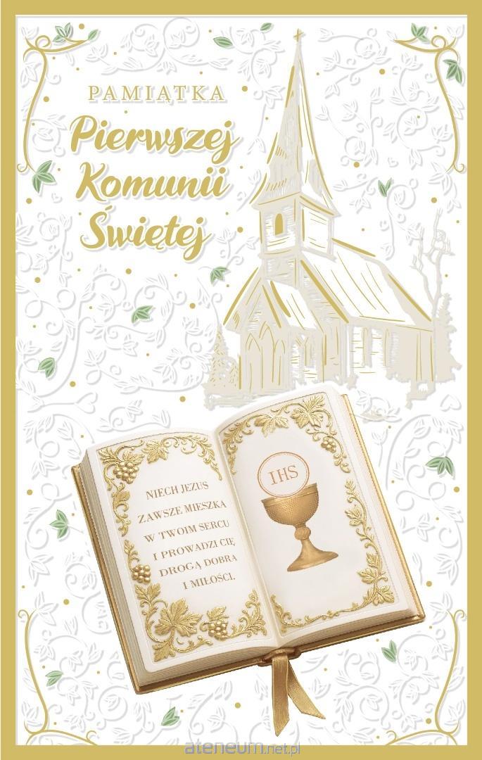 Karnet komunijny, złocony i tłoczony, naklejane elementy, tekst życzeń w środku.