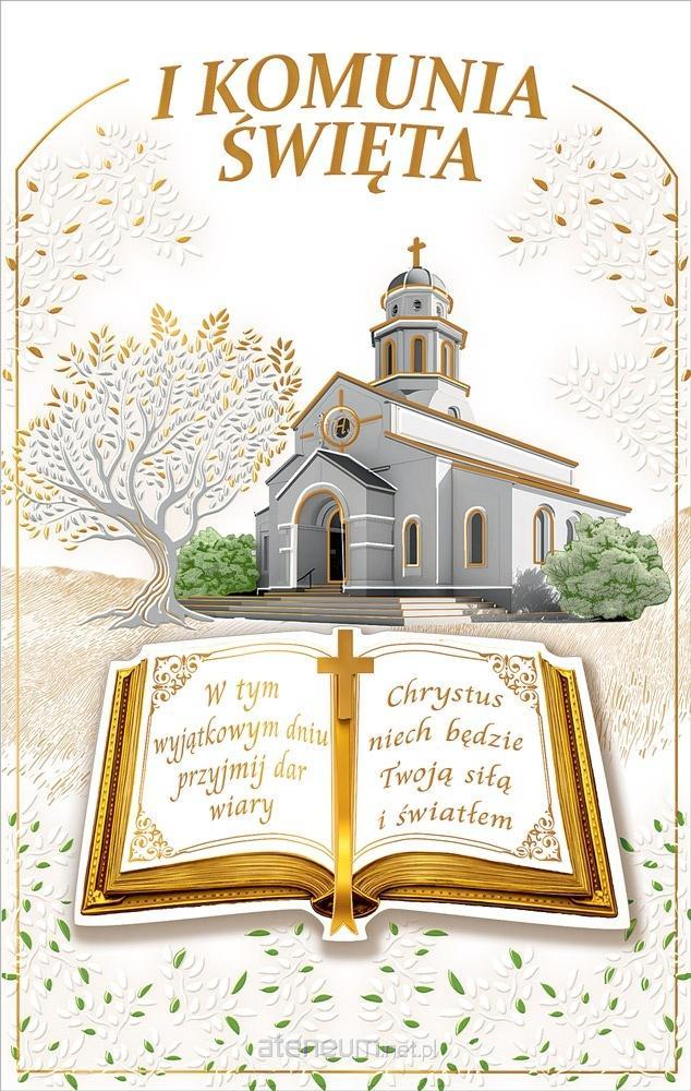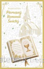Karnet komunijny, złocony i tłoczony, naklejane elementy, tekst życzeń w środku.