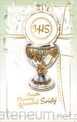 Karnet komunijny, złocony i tłoczony, tekst życzeń w środku.