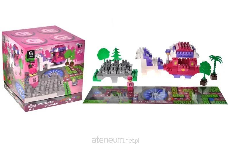 Seria "Blocs&Steps" od QBEE to coś więcej niż tylko klocki. W każdym zestawie, oprócz elementów konstrukcyjnych, znajdziesz tematyczną grę planszową typu "wyścig" oraz grę "memory".\n"Podróż Księżniczek" to wielofunkcyjny zestaw, z którym wyruszysz w bajkową podróż wraz z księżniczkami: pokonuj przeszkody, otwieraj bramy zamków i pomagaj w odnajdywaniu zagubionych królewskich skarbów. Tematyczna gra planszowa dodaje dynamiki zabawie klockami, a wesoła gra "memory" rozwija uważność i pamięć. To idealny wybór dla rozwoju wyobraźni, logiki, motoryki małej oraz ducha współpracy. Trzy gry w jednym zestawie - trzy razy więcej radości!\nWiek: od 3 lat\nZawartość zestawu: 139 elementów, 1 komplet puzzli, 1 kostka, instrukcja.\nWymiary opakowania: 21 x 21 x 21 cm