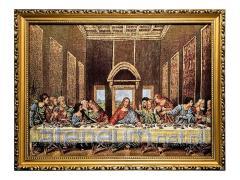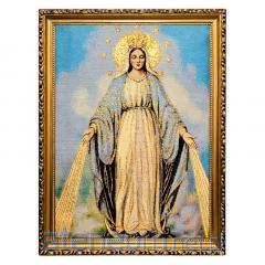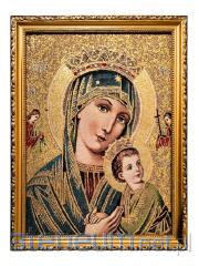 Piękne, bogate kolory oraz dostojne złote nici nadają wizerunkowi wyjątkowego blasku i podniosłości. Haftowana technika tworzy unikalną fakturę i głębię, sprawiając, że obraz jest nie tylko przedmiotem kultu, ale także artystycznym dziełem. Całość oprawiona jest w elegancką, zdobioną złotą ramę o szerokości około 3 cm, która doskonale podkreśla sakralny charakter dzieła.