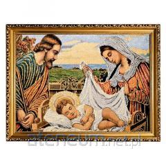 Piękne, bogate kolory oraz dostojne złote nici nadają wizerunkowi wyjątkowego blasku i podniosłości. Haftowana technika tworzy unikalną fakturę i głębię, sprawiając, że obraz jest nie tylko przedmiotem kultu, ale także artystycznym dziełem. Całość oprawiona jest w elegancką, zdobioną złotą ramę o szerokości około 3 cm, która doskonale podkreśla sakralny charakter dzieła.