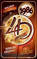 Karnet urodzinowy z rokiem urodzenia oraz najważniejszymi wydarzeniami z tego roku, złocenie, życzenia w środku