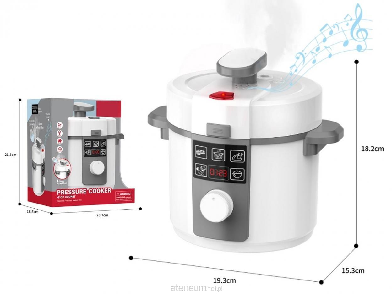 Realistyczny szybkowar dla dzieci to doskonałe uzupełnienie kuchni zabawkowej. Zabawka posiada efekty świetlne i dźwiękowe, imitujące prawdziwe gotowanie - słychać odgłosy pracy urządzenia, a panel z wyświetlaczem oraz podświetlany przycisk dodają realizmu. Pokrętło oraz przyciski umożliwiają "ustawienie" trybu gotowania, co sprawia, że zabawa staje się jeszcze bardziej angażująca. Idealny do odgrywania ról i rozwijania wyobraźni. Wymiary produktu: Wysokość: 18,2 cm; Szerokość: 19,3 cm; Głębokość: 15,3 cm. Wymiary opakowania: 20,7 x 16,5 x 21,5 cm. Zabawka odpowiednia dla dzieci 3+. Świetny pomysł na prezent dla małych miłośników gotowania.