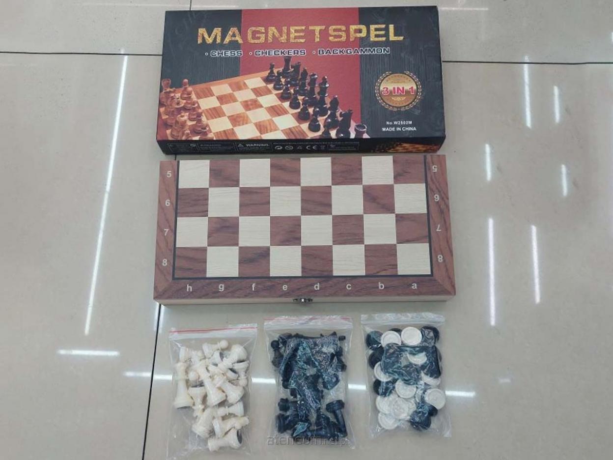 Praktyczny zestaw 3w1 to idealna propozycja dla miłośników klasycznych gier planszowych. W komplecie znajdują się szachy, warcaby oraz tryktrak (backgammon). Magnetyczna, składana plansza zapewnia stabilność pionków podczas gry i sprawdzi się zarówno w domu, jak i w podróży. Po złożeniu plansza pełni funkcję pudełka do przechowywania figur i pionków, co ułatwia transport i zapobiega ich zgubieniu. Klasyczny design w drewnianym stylu nadaje zestawowi elegancki wygląd. Wymiary planszy (po rozłożeniu): ok. 34 x 34 cm. Zawartość zestawu: komplet figur szachowych (białe i czarne); pionki do warcabów; pionki do tryktraka;