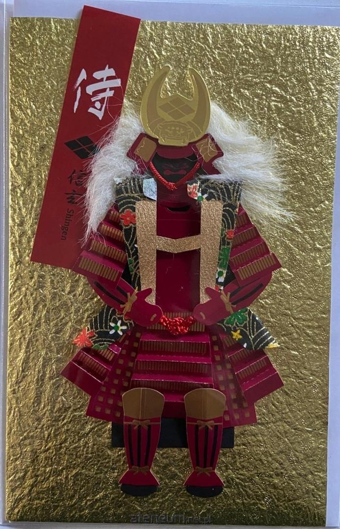 Elegancki japoński karnet premium z piękną, artystyczną ilustracją. Przedstawia imponującą postać samuraja w pełnej, tradycyjnej zbroi (yoroi) w intensywnym czerwonym kolorze. Zbroja ozdobiona jest złotymi i białymi detalami, charakterystycznymi dużymi naramiennikami oraz hełmem z rogami. Ilustracja oddaje siłę, majestat i elegancję japońskiego wojownika. Czerwień zbroi na złotym tle tworzy bardzo dynamiczną i szlachetną kompozycję w klasycznym stylu.